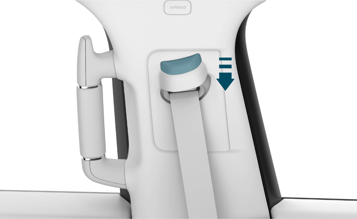 下移:按压高度调节器的释放按钮并向下移动(下图箭头指示),根据需要将肩部安全带调整至合适高度,松开释放按钮,听到“咔哒”声,使其锁定。
