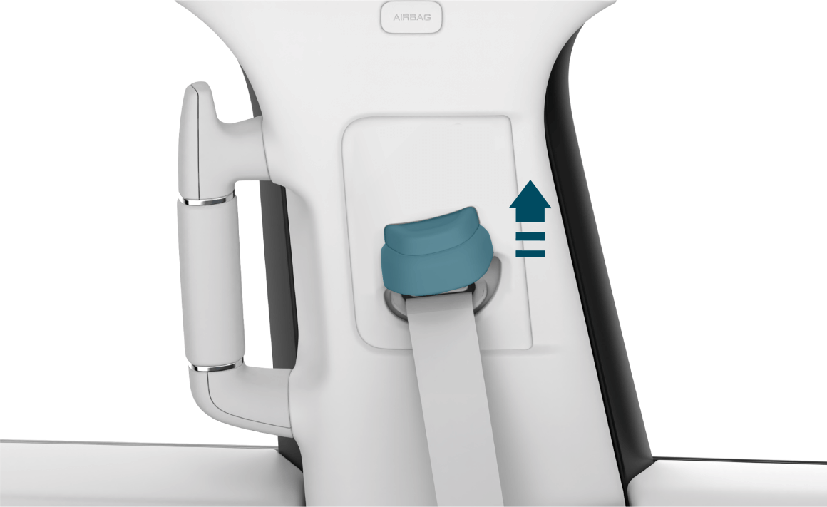 上移:向上推动高度调节器(下图箭头指示),根据需要将肩部安全带调整至合适高度。