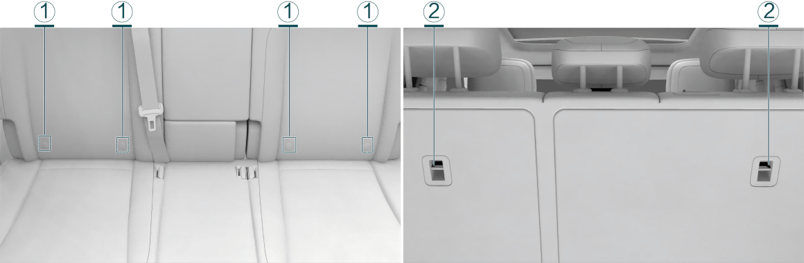 车辆后排座椅装备有 ISOFIX 固定系统,可用于儿童安全座椅的连接安装。该系统由下固定点 ① 和上拉带固定点 ② 组成。下固定点 ①,位于座椅靠背与座垫的缝隙内,用于安装带 ISOFIX 接口的儿童安全座椅,上拉带固定点 ② 位于座椅靠背后部。您可以根据儿童安全座椅类型及儿童安全座椅的安装说明书,选择上拉带固定点 ②、下固定点 ① 或三点式安全带用于配合安装。