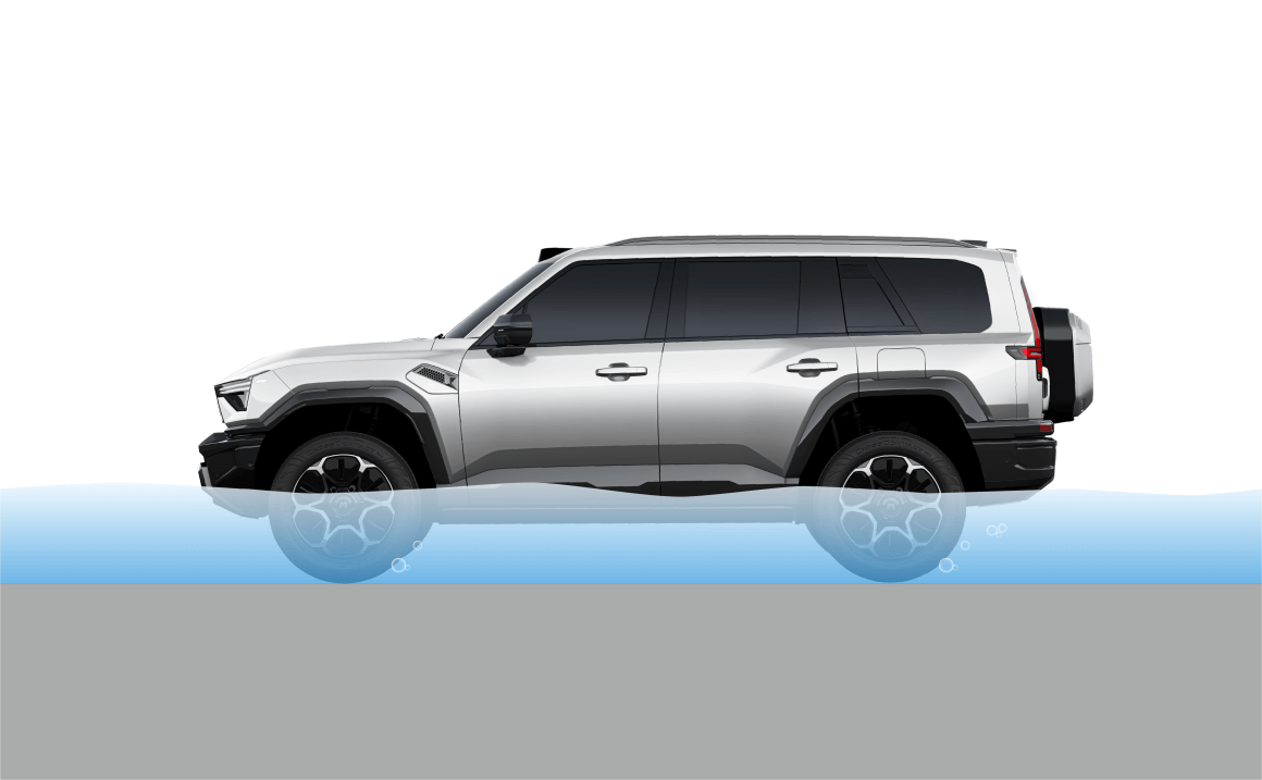 当驾驶车辆需要涉水行驶时,请先开启涉水模式。涉水行驶时,需特别注意水深,确保在不超过最大涉水深度的情况下,中途不要停车,不要切换车辆行驶模式,在 5 km/h ~ 10 km/h 速度下匀速驾驶,通过积水路段。
