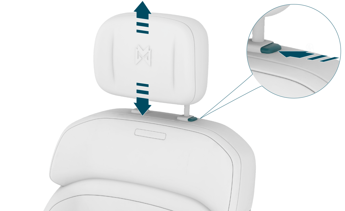 按住锁止按键,上提 / 下压头枕至合适高度,松开锁止按键,向下按头枕确认头枕已锁定。