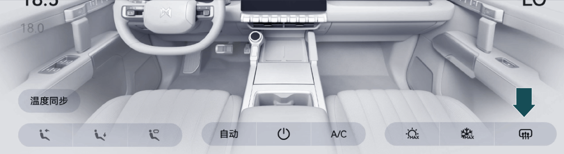 在中控屏空调界面,点触外后视镜加热按键,开启加热功能,可清除外后视镜与后风窗玻璃上的雾气或冰霜,再次点触该按键,关闭加热功能。