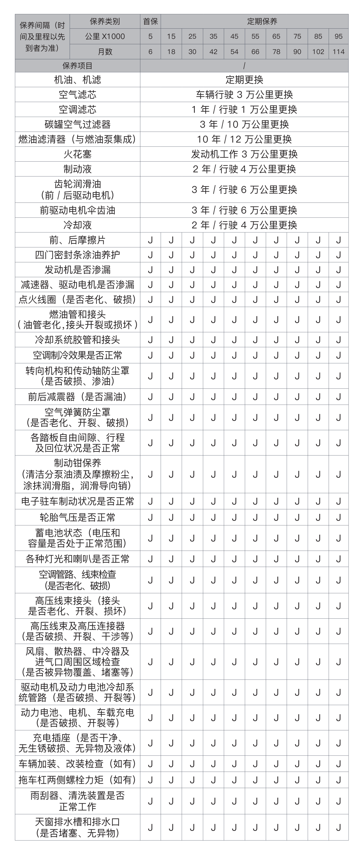 请按照 12 个月或整车 1 万公里(以先到者为准)的保养间隔对车辆进行全方位的定期保养,保养项目详见下表: