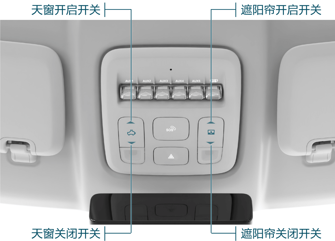 车辆上电后,天窗控制按键与遮阳帘控制按键可控制天窗 / 遮阳帘打开 / 关闭。