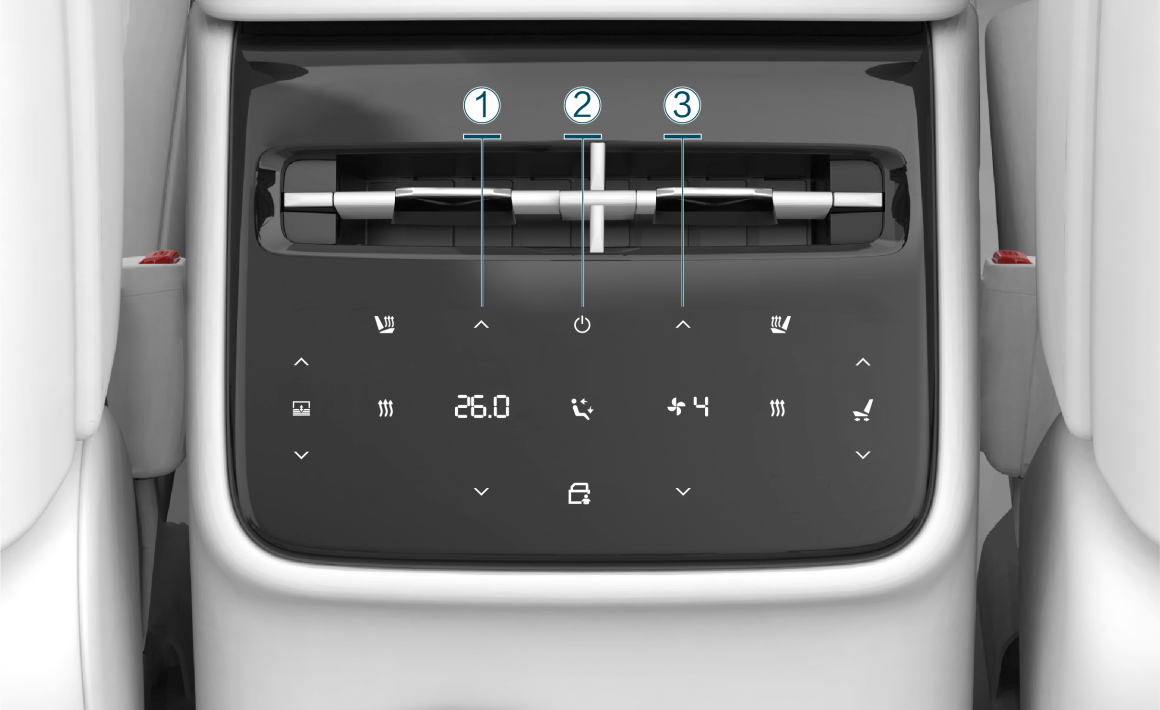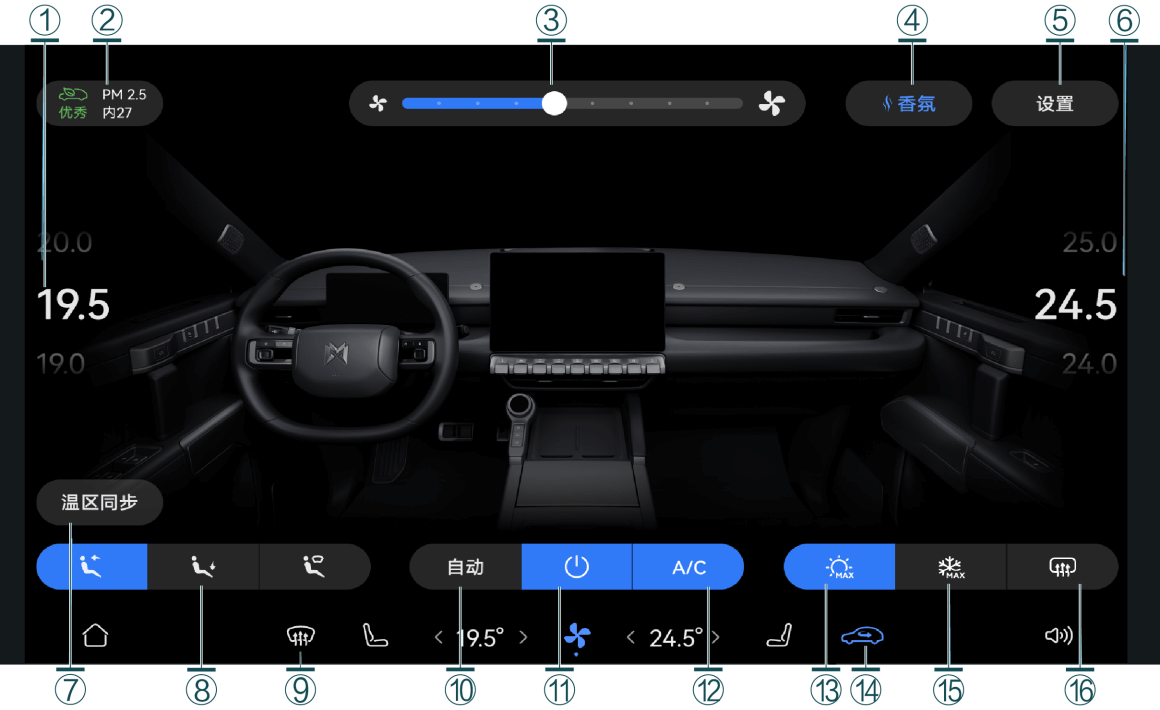 | ⑦ | 温区同步 | 温度同步开关,点触开启可使主副驾温度一致。 |