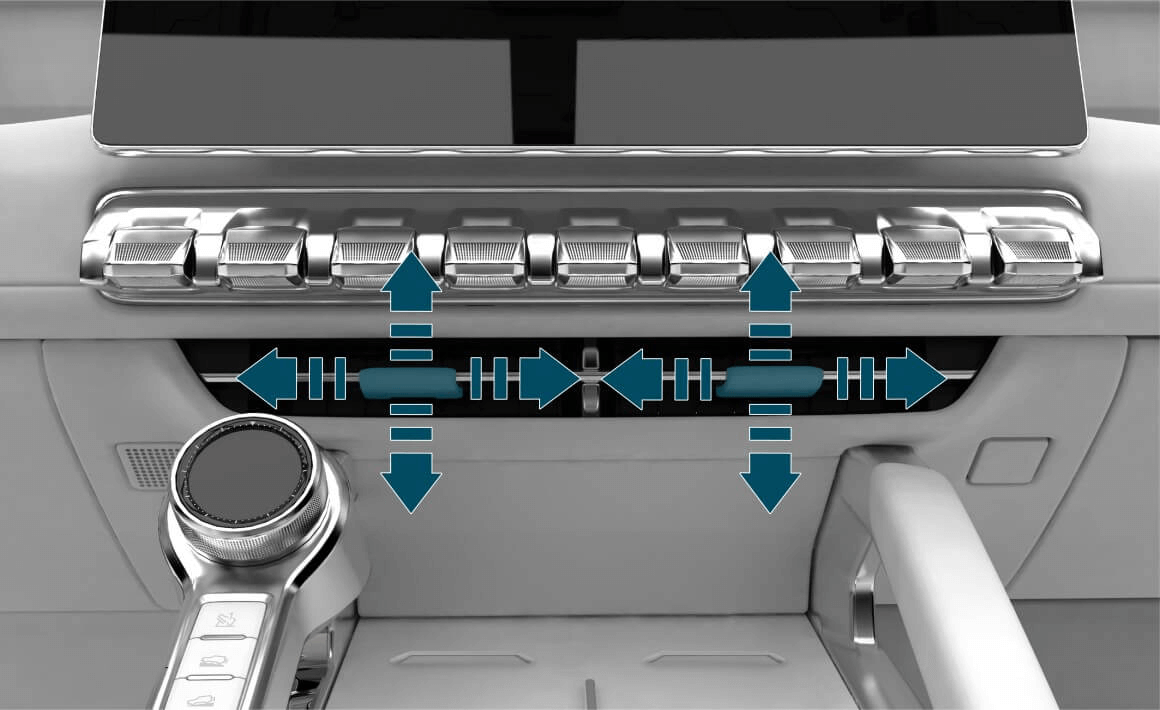 - 前排两侧吹面出风口和后排中央出风口调节方法与前排中央吹面出风口一致。