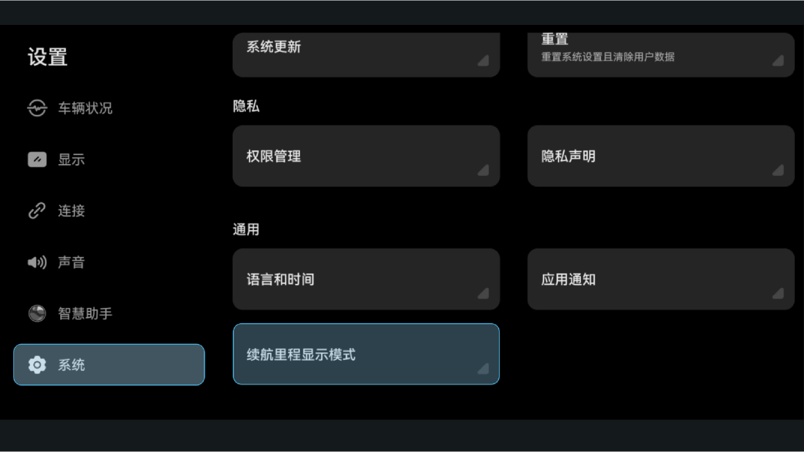 在中控屏设置 ﹥﹥ 系统 ﹥﹥ 通用 ﹥﹥ 续航里程显示模式界面,点触续航里程显示模式,您可以根据偏好选择续航里程显示模式。