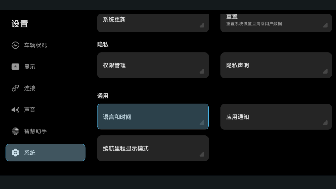 在中控屏设置 ﹥﹥ 系统 ﹥﹥ 通用 ﹥﹥ 语言和时间界面,选择您想要设置的语言和时间显示,可以选择中文或英文、24 小时制或 12 小时制。
