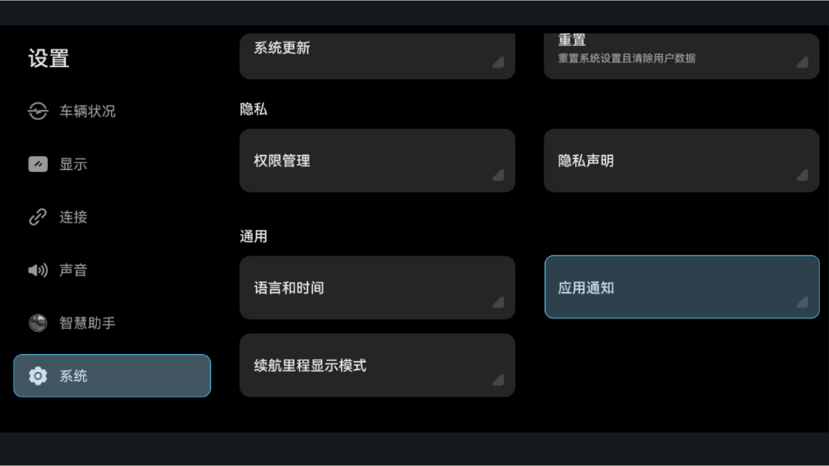 - 进入中控屏设置 ﹥﹥ 系统 ﹥﹥ 通用 ﹥﹥ 应用通知界面。