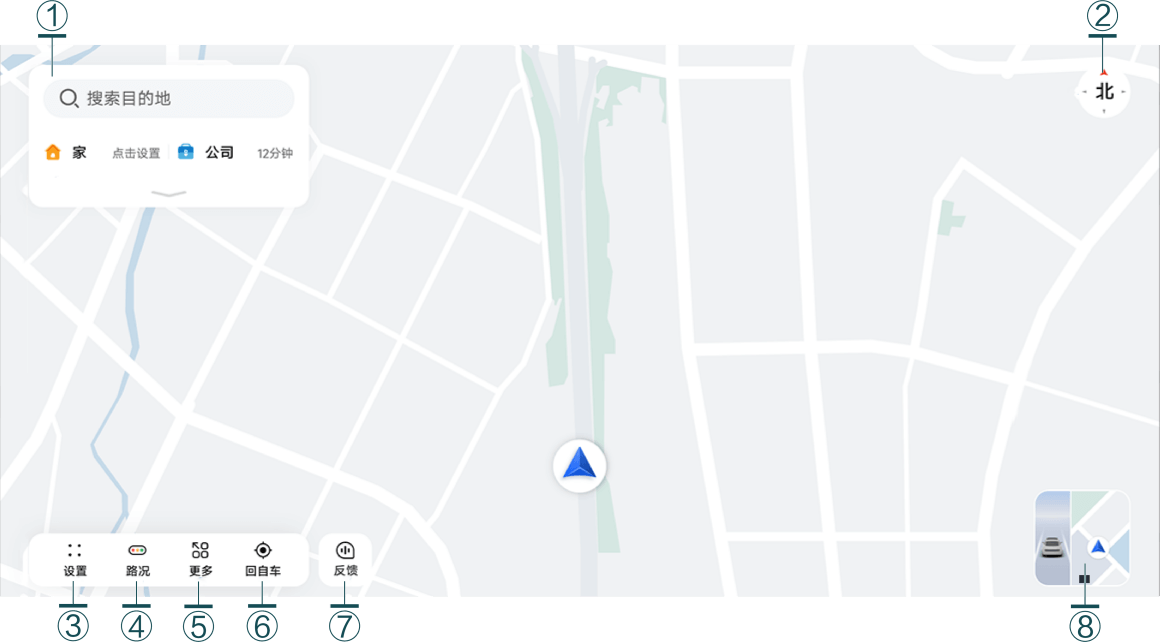 | ① | 通勤卡片 | 登录车主账号,设置家或公司的常用位置后可以快速查看行车所需时间及路况,还可以实现一键导航回家、去公司。下拉通勤卡片可查看收藏地点和历史目的地。 |