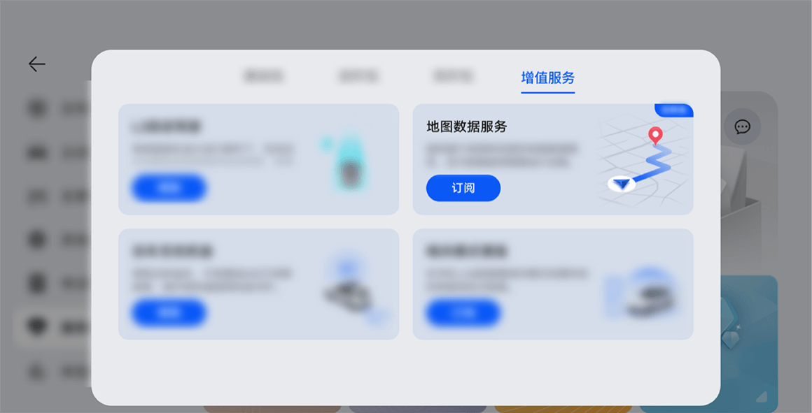 图标﹥﹥辅助驾驶﹥﹥ 服务订阅 ﹥﹥ 增值服务 ﹥﹥ 地图数据服务界面,点触订阅按钮,订阅地图数据服务。