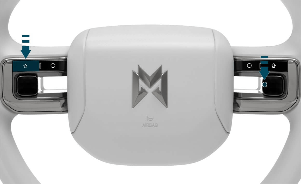 如果 ADS 无响应或出现异常,可将车辆停放至安全地点,档位切换至 P 档后,同时长按方向盘左侧自定义按键和右键上一曲按键 8 秒(如上图所示),直至显示屏黑屏,待中控屏黑屏后松开,ADS 将随中控屏一起重启。