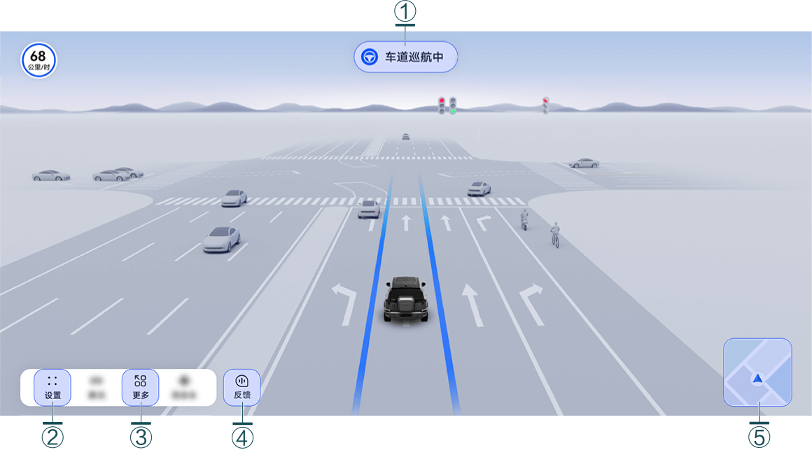 | ④ | 意图说明 | 关于车辆 ADS 意图的实时文字提示。帮助驾驶员更好地理解、预测自车 ADS 行为。 |