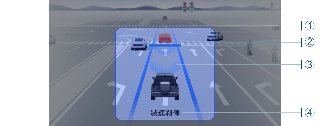 | ② | 刹停位置 | 自车意图刹停的位置。该位置随前车、障碍物、交通信号等因素实时变化。 |