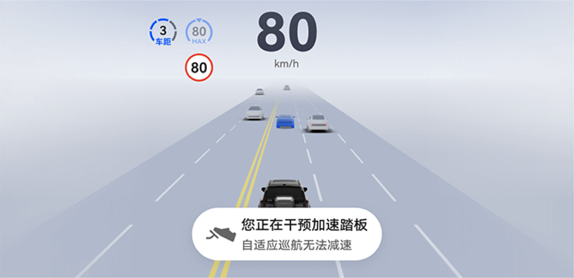 车辆正常巡航过程中,干预加速踏板期间,系统不再辅助驾驶员控制车速和跟车距离,仪表屏上 ACC 图标闪烁,伴有弹窗、提示音和语音播报。