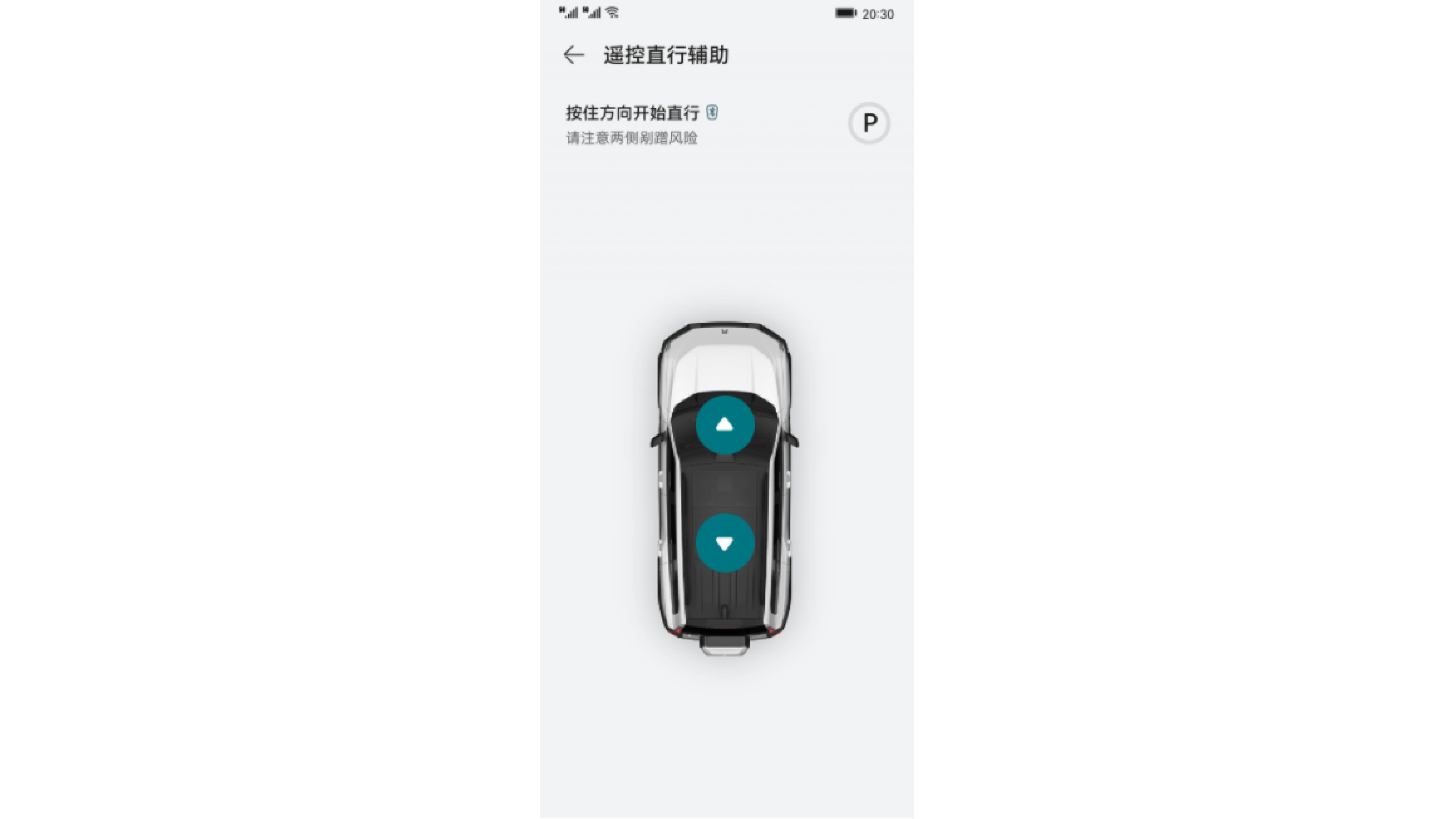- 遥控车辆直线前进或后退时,系统不支持绕开车辆两侧的障碍物,驾驶员务必确保车辆周围环境安全适宜,无障碍物碰撞风险。若车辆行进方向存在障碍物时,手机 APP 会弹出碰撞风险提醒消息,驾驶员确认后仍继续操作“遥控直行辅助”,车辆可能发生碰撞风险。