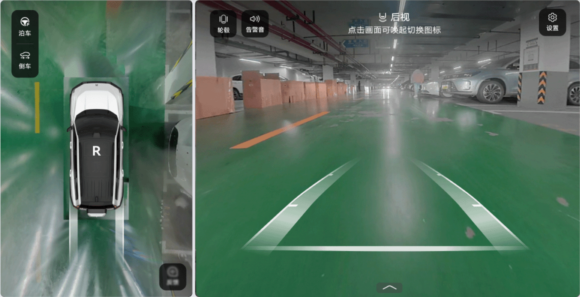 挂 R 挡(请确认中控屏的“设置 ﹥﹥ 辅助驾驶 ﹥﹥ 全景环视”已设置了挂 R 挡默认打开 “360° 全景环视”)。