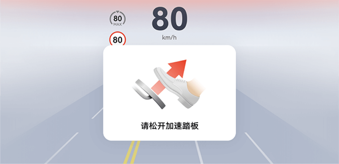 在驾驶员深踩加速踏板且车辆存在碰撞风险时,系统会抑制动力输出,从而限制车辆的加速能力,并提醒驾驶员及时松开加速踏板。