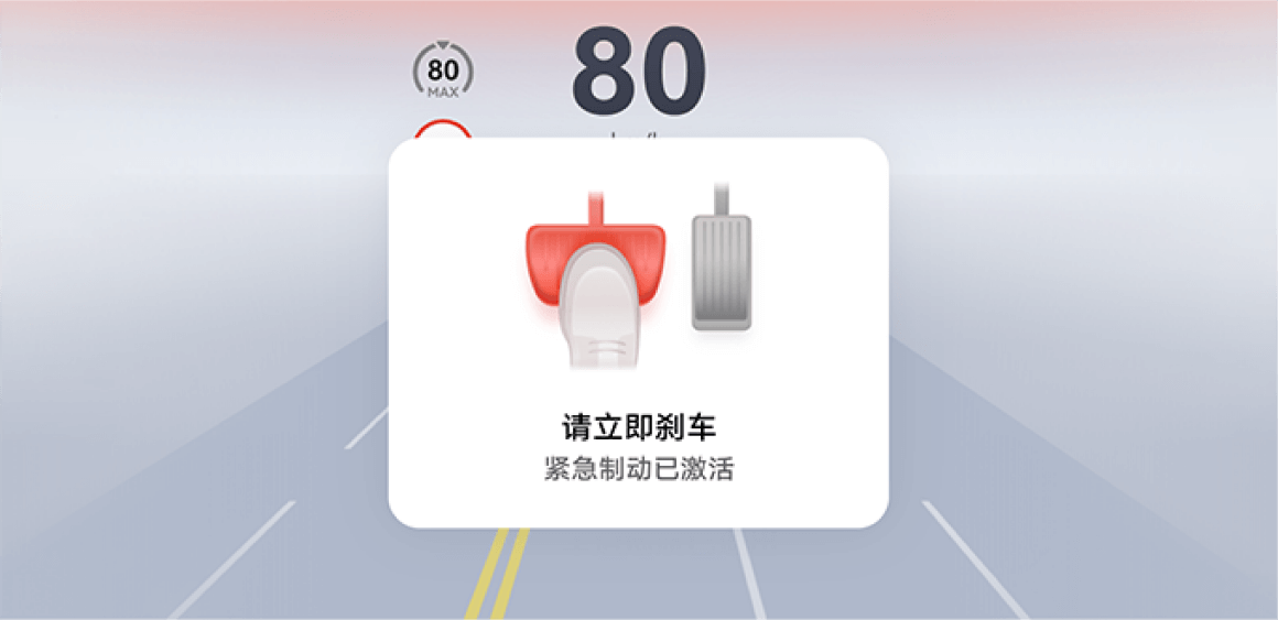 - 发生 AEB 后,驾驶员应立即采取措施,避免车辆陷入进一步的危险中,避免因紧急制动导致其他事故或伤害。例如,对于确实有碰撞风险的场景,驾驶员应及时踩制动踏板确保制动;对于不必要的制动,驾驶员可以通过快速踩下加速踏板、转动方向盘或松开加速踏板后再次踩下加速踏板的方式来中断制动。