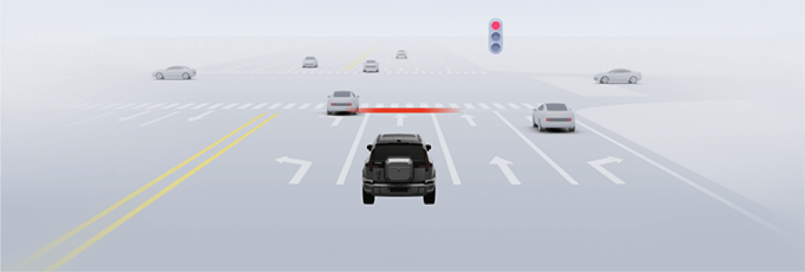 闯红灯提醒:当前车道的机动车交通信号灯为红灯,而自车未停车导致存在闯红灯风险时,组合仪表上自车前方的停止线红色高亮,并伴有提示音。