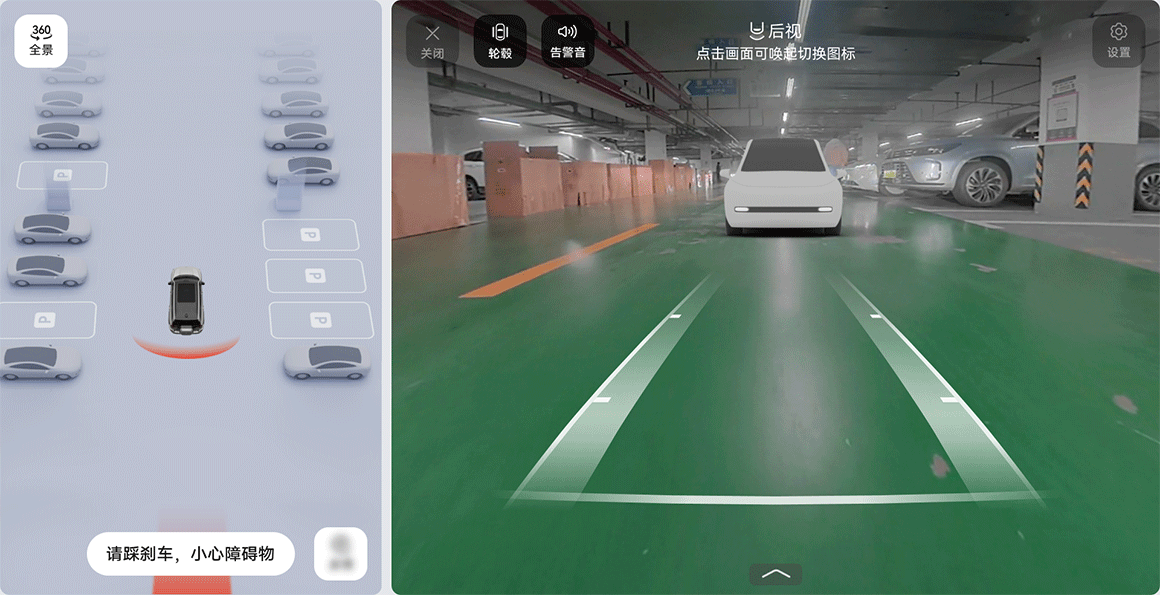 实施 RAEB 时,中控屏上会在自车后方显示动态红色弧线,并将风险目标红色高亮显示,伴有“请踩刹车”的文字提示,提醒驾驶员采取制动措施。