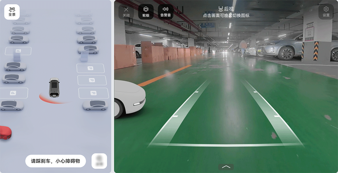 实施 RCTB 时,中控屏上会在自车侧后方来车方向显示动态红色弧线,并将风险目标红色高亮显示,伴有“请踩刹车”的文字提示,提醒驾驶员采取制动措施。