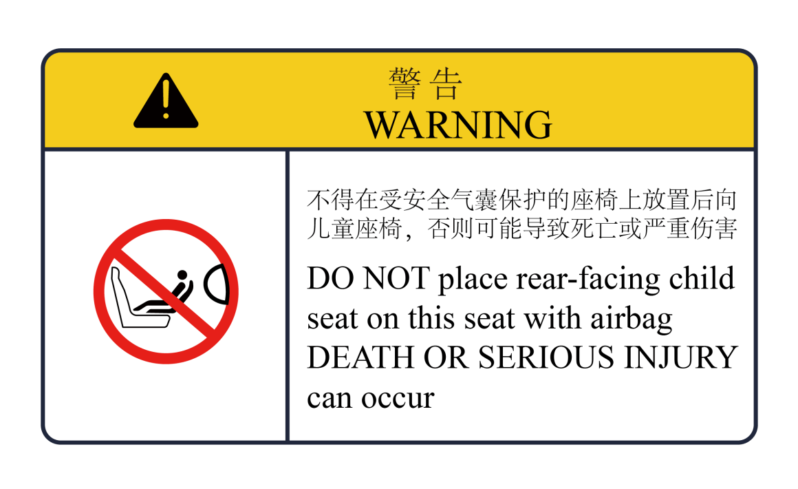 - 请勿让儿童坐于前排座椅上,否则气囊展开时会对儿童造成严重伤害。