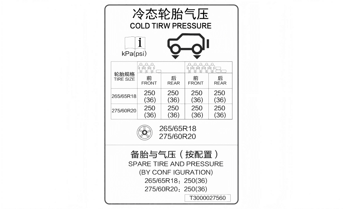 调整胎压,标准胎压数据标签,粘贴于左侧 B 柱位置。